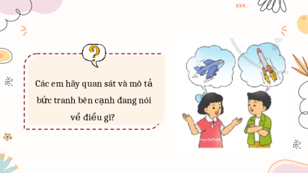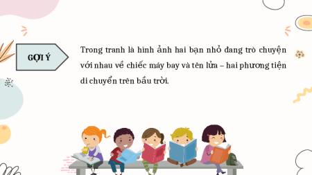 Trong tranh là hình ảnh hai b n ạ nh ỏ đang trò chuy n ệ G I Ợ Ý với nhau v ề chi c ế máy bay và tên l a ử – hai phư n ơ g ti n ệ di chuyển trên b u ầ tr i ờ .