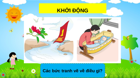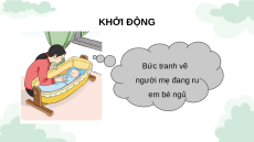 Các bức tranh vẽ về điều gì? KHỞI ĐỘNG Bông hoa nở Tờ lịch Dòng sông Các chú chim hiền hoà chảy bay lượn KHỞI ĐỘNG Bức tranh vẽ người mẹ đang ru em bé ngủ