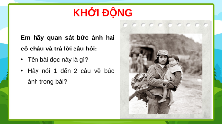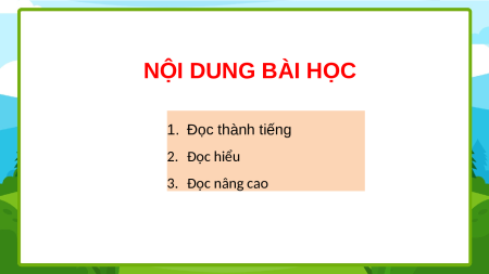 • Hãy nói 1 đến 2 câu về bức ảnh trong bài? BÀI 13 ĐỌC 3: BỨC ẢNH NỘI DUNG BÀI HỌC 1. Đọc thành tiếng 2. Đọc hiểu 3. Đọc nâng cao