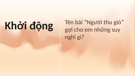 Khởi động Tên bài “Người thu gió” gợi cho em những suy nghĩ gì? Khởi động Một người có tài năng thu hút gió hay có sức mạnh diệu kì hút hết gió về mình