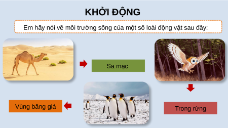 Em hãy nói về môi trường sống của một số loài động vật sau đây: Sa mạc Vùng băng giá Trong rừng
