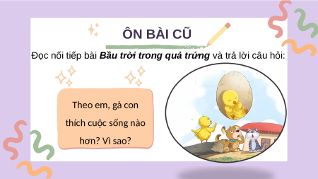 Đọc nối tiếp bài Bầu trời trong quả trứng và trả lời câu hỏi: Theo em, gà con thích cuộc sống nào hơn? Vì sao? KHỞI ĐỘNG