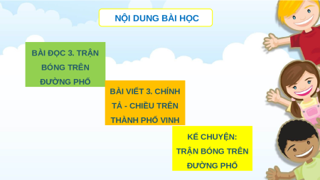 ĐẾN VỚI TIẾT HỌC MỚI NỘI DUNG BÀI HỌC BÀI ĐỌC 3. TRẬN BÓNG TRÊN ĐƯỜNG PHỐ BÀI VIẾT 3. CHÍNH TẢ - CHIỀU TRÊN THÀNH PHỐ VINH KỂ CHUYỆN: TRẬN BÓNG TRÊN ĐƯỜNG PHỐ