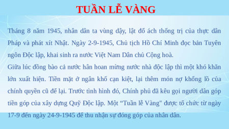 tiền góp của xây dựng Quỹ Độc lập. Một “Tuần lễ Vàng" được tổ chức từ ngày