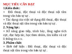 VỀ DỰ GIỜ MÔN NGỮ VĂN TỰ SỰ MIÊU TẢ MIÊU TẢ NGHỊ ĐỐI THOẠI, NỘI TÂM LUẬN ĐỘC THOẠI, ĐỘC THOẠI NỘI TÂM Câu Nhân vật Câu chuyện hấp sinh động chuyện ? dẫn, gợi thêm phần cảm, sinh triết lí động MỤC TIÊU CẦN ĐẠT 1.Kiến thức: