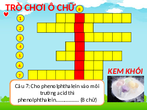 ngang được 40đ, sau 3 ô được 30đ, sau 4 ô được 20đ. TRÒ CHƠI Ô CHỮ 8 1 E L E C T R O N 2 C A R B O N 3 I O D I N E 4 p H 5 V I K H U A N 6 K H I KEM KHÓI 7 K H O N G M A U CCâu CC âu âu7h âu: à 3: Cn 5:hg M o d ộ Đapọc t ns h : ố g mộ u en y ... ol t p ênl h oại tố át th a lđ h tri ồ al ei n ăn og ển b v ì v enn ào ặ cht C C âu môi C âuC âu4 : âu 2 6: Đ ểT1 Th: hb iuCếh an tđ ấ c t h m ơn o ủ ứcxi yc h h ếu đất óa ộd C o ac h lià nd c ori h gu và n ấ y e tb ên b t as ố ó e ằn đ tr ư th ờn ạng ư g ờn thgp áih ở ố rtr r ắn ư ấ môit ở ờnđ trg ư i ợc ều aci ờn d g ki g iới ện tr thì u tr th n ẻ g ư yêu ờn tín g h tga h n óa hận ọc d c ự ác.................. nahào vđ à t ẩ ạ o y o th ....? .....? ( (8 àn 2 c 3 hcc? h h h( ữ ữ 6) ữ) ) chữ)? . th p í h ch en ? ol(7 p hch th ữ al kh (6 ei 7nôn ch g ữ )theo th ................ ứ (8 tự ch )ữ)