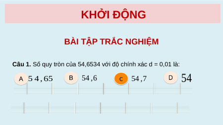 Câu 1. Số quy tròn của 54,6534 với độ chính xác d = 0,01 là: 5 4 , 65 54 ,6 C 54 ,7 54