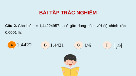 Câu 2. Cho biết = 1,44224957… số gần đúng của với độ chính xác 0,0001 là: A 1,4422 1,4421 1,442 1,44
