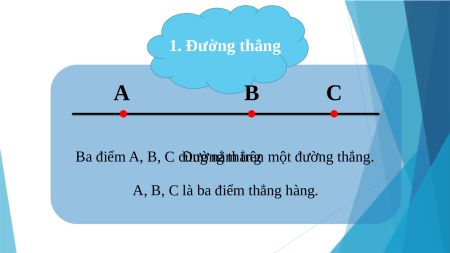 con đường thẳng tắp và tranh nào là con đường uốn cong Bài 43 ĐƯỜNG THẲNG – ĐƯỜNG CONG – ĐƯỜNG GẤP KHÚC 1. Đường thẳng A B C Ba điểm Đư A, B, C c ờng thẳ ùng nằ ng