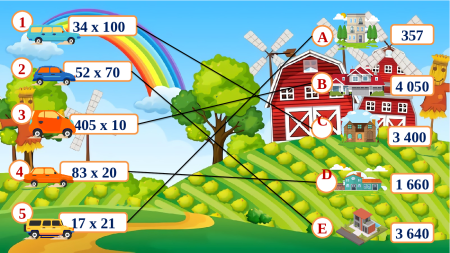 đưa các xe về đúng nhà của mình nhé. 1 34 x 100 A 357 2 52 x 70 B 4 050 3 C 405 x 10 3 400 4 83 x 20 D 1 660 5 17 x 21 E 3 640