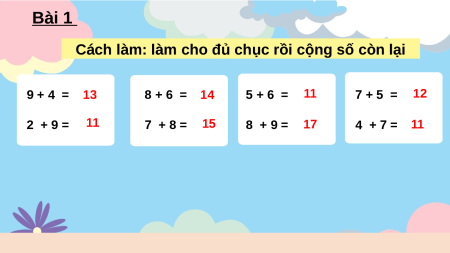 Cách làm: làm cho đủ chục rồi cộng số còn lại 9 + 4 = 13 8 + 6 = 14 5 + 6 = 11 7 + 5 = 12 2 + 9 = 11 7 + 8 = 15 8 + 9 = 17 4 + 7 = 11