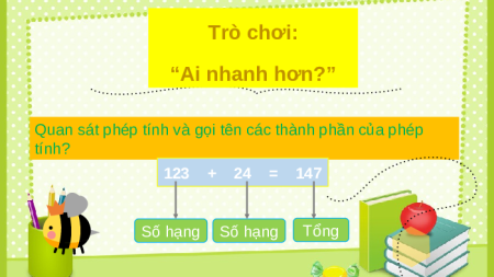 Quan sát phép tính và gọi tên các thành phần của phép tính? 123 + 24 = 147 Số hạng Số hạng Tổng BÀI: