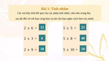sau đó đổi vở với bạn cùng bàn và nói cho bạn nghe cách làm của mình 2 x 6 = ? 12 5 x 5 = ? 25 2 x 3 = ?6 5 x 8 = ? 40 2 x 9 = ? 18 5 x 10 = ? 50