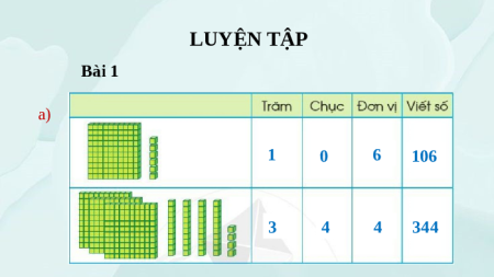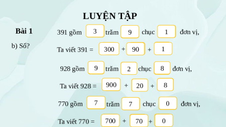 chữ số giống nhau và bé hơn số bạn vừa viết, BÀI 93 EM ÔN LẠI NHỮNG GÌ ĐÃ HỌC LUYỆN TẬP Bài 1 a) 1 0 6 106 3 4 4 344 LUYỆN TẬP Bài 1 391 gồm ?3 trăm ?9 chục ? 1 đơn vị, b) Số? Ta viết 391 = ? 300 + ? 90 ? + 1 928 gồm ?9 trăm ?2 chục ?8 đơn vị, ? Ta viết 928 = 900 + ? 20 ? + 8 770 gồm ?7 trăm ? 7 chục ?0 đơn vị, Ta viết 770 = ? 700 + ? 70 ? + 0