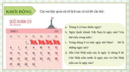 Các em hãy quan sát tờ lịch sau và trả lời câu hỏi: a. Tháng 9 có 30 ngày.
