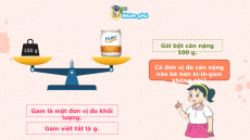 Gam là một đơn vị đo khối lượng. Gam viết tắt là g. Muối 1 Muối 600 g 400 g 600 g + 400 g = 1 000 kg g Một ki-lô-gam bằng bao nhiêu gam nhỉ? 1 kg = 1 000 g 1 000g = 1 kg