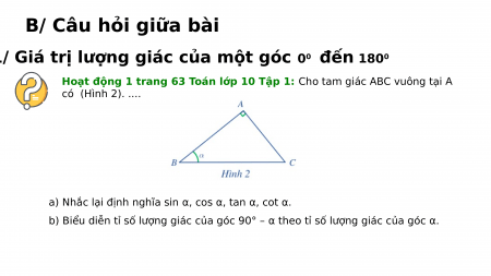 Hoạt động 1 trang 63 Toán lớp 10 Tập 1: Cho tam giác ABC vuông tại A có (Hình 2). ....