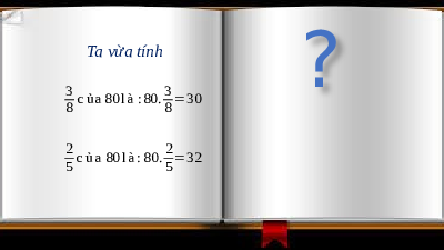 Hòa đọc được số trang cuốn truyện. Tính số trang bạn Hòa đã đọc trong mỗi ngày? Ta vừa tính ? 3 3 c ủ a 80 l à :80. =30 8 8 2 2 c ủ a 80 l à : 80. =32 5 5 Tiết 56, §6: