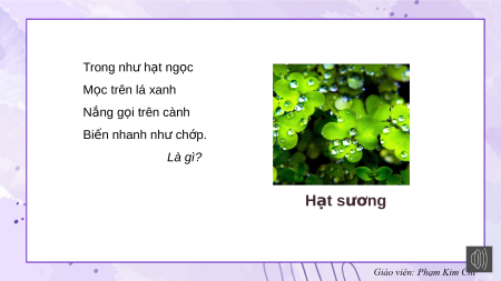 VẺ ĐẸP QUANH EM GIẢI ĐỐ VUI Trong nh h ư t ạ ng c ọ Mọc trên lá xanh Nắng g i tr ọ ên cành Biến nhanh nh ư ch p. ớ Là gì? Hạt sương