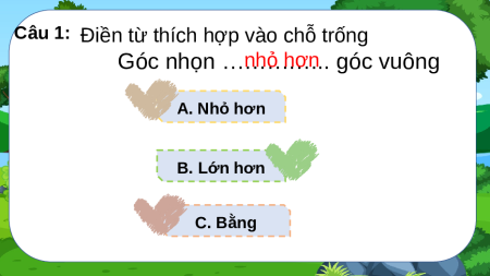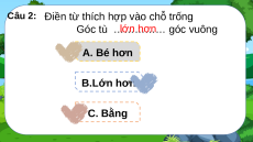 Góc nhọn ……….….. góc nhỏ hơn vuông A. Nhỏ hơn B. Lớn hơn C. Bằng