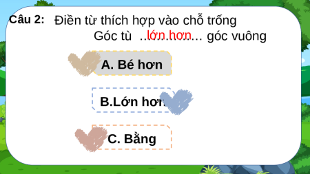 Câu 2: Điền từ thích hợp vào chỗ trống Góc tù …… lớ … n h … ơ … n góc vuông A. Bé hơn B.Lớn hơn C. Bằng
