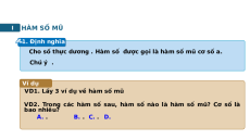 VD2. Trong các hàm số sau, hàm số nào là hàm số mũ? Cơ số là