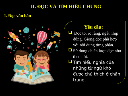 II. ĐỌC VÀ TÌM HIỂU CHUNG 1. Đọc văn bản Yêu cầu: