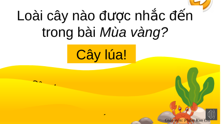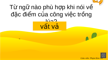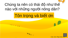 VẺ ĐẸP QUANH EM Giáo viên: Ph m ạ Kim Chi START Giáo viên: Ph m ạ Kim Chi Từ ng ữ nào phù h p ợ khi nói v ề đ c ặ đi m ể c a ủ công vi c ệ tr ng ồ lúa? vất vả dễ dàng ả v t v ấ nhanh chóng Giáo viên: Ph m ạ Kim Chi Chúng ta nên có thái đ ộ nh ư th ế nào v i ớ nh ng ữ ngư i ờ nông dân? Tôn tr n ọ g và bi t ế n ơ Khinh bỉ Tôn trọn v g à Giáo viên: Ph m ạ Kim Chi Xem thường biết ơn