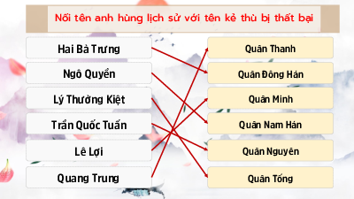 Nối tên anh hùng lịch sử với tên kẻ thù bị thất bại Hai Bà Trưng Quân Thanh Ngô Quyền Quân Đông Hán Lý Thường Kiệt Quân Minh Trần Quốc Tuấn Quân Nam Hán Lê Lợi Quân Nguyên Quang Trung Quân Tống 02 Hình thành kiến thức mới