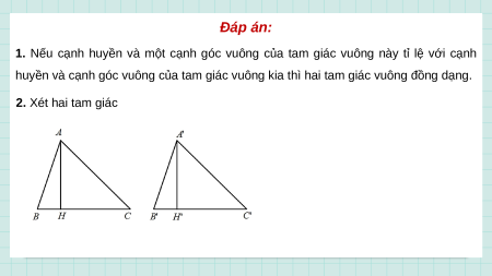 1. Nêu dấu hiệu đặc biệt nhận biết hai tam giác vuông đồng dạng?
