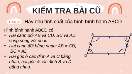 nhau; hai góc ở các đỉnh B và D bằng nhau. KIỂM TRA BÀI CŨ