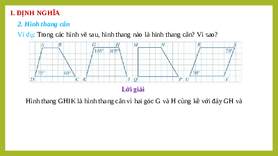 Ví dụ: Trong các hình vẽ sau, hình thang nào là hình thang cân? Vì sao? Lời giải