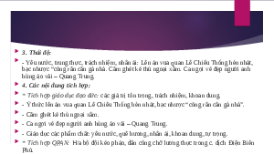 - Yêu nước, trung thực, trách nhiệm, nhân ái: Lên án vua quan Lê Chiêu Thống hèn nhát,