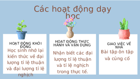 cơ bản của các đại lượng tỉ lệ Các hoạt động dạy học HOẠT ĐỘNG KHỞI HOẠT ĐỘNG THỰC ĐỘNG HÀNH VÀ VẬN DỤNG GIAO VIỆC VỀ NHÀ Học sinh nhớ lại Nhận biết các đại Bài tập ôn tập kiến thức về đại lượng tỉ lệ thuận và củng cố lượng tỉ lệ thuận và tỉ lệ nghịch và đại lượng tỉ lệ trong thực tế. nghịch