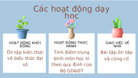 số để tính điểm trung bình môn học kì Các hoạt động dạy học HOẠT ĐỘNG KHỞI HOẠT ĐỘNG THỰC GIAO VIỆC VỀ ĐỘNG HÀNH NHÀ Ôn tập kiến thức Tính điểm trung Bài tập ôn tập về biểu thức đại bình môn học kì và củng cố số theo quy định của Bộ GD&ĐT