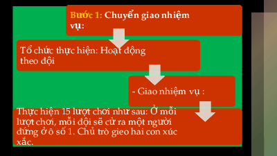 HOẠT ĐỘNG: THỰC HÀNH Bước 1: Chuy n ể giao nhi m ệ v : ụ Tổ ch c ứ th c ự hi n ệ : Ho t ạ động theo đ i ộ - Giao nhi m ệ v : ụ Th c ự hi n ệ 15 l t ượ ch i ơ nh sa ư u: Ở m i ỗ lượt ch i, ơ m i ỗ đ i s ộ c ẽ ử ra m t ộ ng i ườ đ n ứ g ở ô s ố 1. Ch ủ trò gieo hai con xúc x c ắ .