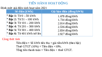 Tiền điện = Số kWh tiêu thụ ×Dgiá tiền/kWh (theo bậc)