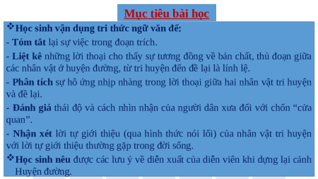 Học sinh nêu được các lưu ý về diễn xuất của diễn viên khi dựng lại cảnh Huyện đường. 01 Khởi động Nhiệm vụ