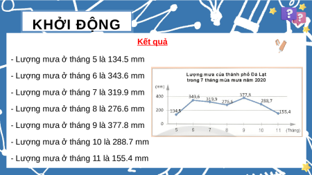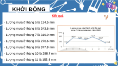 Đà Lạt năm 2020 được biểu diễn theo số n chỉ tháng trong biểu đồ dưới đây. Quan sát biểu đồ và cho biết lượng mưa ở mỗi tháng là bao nhiêu. KHỞI ĐỘNG Kết quả