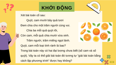 Trong bài toán này có hai đại lượng chưa biết (số cam và số