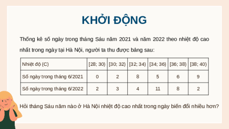 [28; 30) [30; 32) [32; 34) [34; 36) [36; 38) [38; 40) Số ngày trong tháng 6/2021 0 2 8 5 6 9 Số ngày trong tháng 6/2022 2 3 4 11 8 2