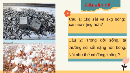 Đặt v n đ ấ ề Câu 1: 1kg s t ắ và 1kg bông: cái nào n ng h ặ n? ơ Câu 2: Trong đ i ờ s ng, ố ta th ng ườ nói s t ắ n ng ặ h n ơ bông. Nói nh th ư có đ ế úng không? CHƯ NG I Ơ II KH I Ố LƯ N Ợ G RIÊNG VÀ ÁP SU T Ấ BÀI 13: KH I Ố LƯ NG Ợ RIÊNG I. Thí nghi m ệ Nội dung bài h c ọ II. Kh i ố lư n ợ g riêng, đ n ơ v ịkh i ố lư n ợ g riêng
