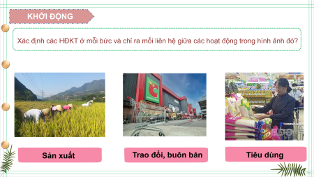 Xác định các HĐKT ở mỗi bức và chỉ ra mối liên hệ giữa các hoạt động trong hình ảnh đó? Sản xuất Trao đổi, buôn bán Tiêu dùng