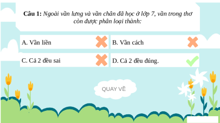 còn được phân loại thành: A. Vần liền B. Vần cách C. Cả 2 đều sai D. Cả 2 đều đúng. QUAY VỀ