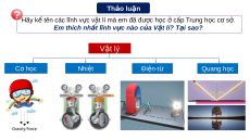 đối và công th c E = ứ mc2 Th o ả lu n ậ Hãy k ể tên các lĩnh v c ự v t ậ lí mà em đã đư c ợ h c ọ ở c p ấ Trung h c ọ c ơ s . ở Em thích nh t ấ lĩnh v c ự nào c a ủ V t ậ lí? T i ạ sao? Vật lý C ơ h c ọ Nhi N t ệ Đi Đ n- ệ t n- ừ Quang h c ọ I