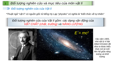 Đối tượng nghiên c u ứ c a ủ V t ậ lí g m ồ : các d ng ạ v n ậ đ ng ộ c a ủ V T Ậ CH T Ấ (ch t ấ , trư n ờ g) và NĂNG LƯ N Ợ G E = mc2 Vào năm 1905,