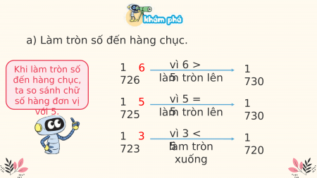 a) Làm tròn số đến hàng chục. Khi làm tròn số 1 vì 6 > 6 1 đến hàng chục, 726 là5 m tròn lên 730 ta so sánh chữ số hàng đơn vị 1 vì 5 = 5 1 với 5. 725 là5 m tròn lên 730 1 vì 3 < 3 1 723 5 làm tròn 720 xuống