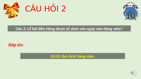 Câu 2: Lễ hội Đền Hùng được tổ chức vào ngày nào hàng năm? Đáp án: