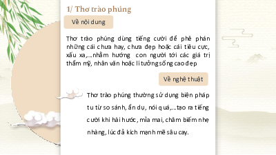 - Bộ bài giảng powerpoint Bài 4: Tiếng cười trào phúng trong thơ Ngữ văn 8 Kết nối tri thức bao gồm đầy đủ các bài giảng trong cả năm. Bộ bài giảng được thiết kế theo phong cách hiện đại, đẹp mắt, trình bày chi tiết cho từng phần học và bám sát chương trình Sách giáo khoa Ngữ văn 8 Kết nối tri thức.