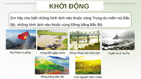 Bộ; những hình ảnh nào thuộc vùng Đồng bằng Bắc Bộ. Núi Phan xi păng Vùng đất ngập nước Sông Hồng vào mùa cạn Tuyết rơi ở Sa Pa Đồng bằng Bắc Bộ Cao nguyên Mộc Châu